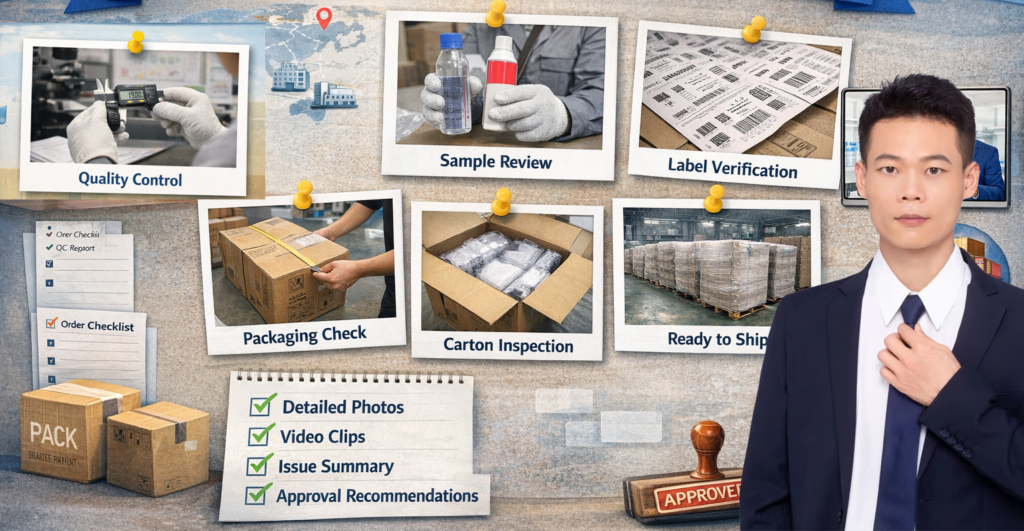 It is a structured photo and video confirmation service used to verify samples, packaging, labels, cartons, pallets, warehouse handling, or shipment-ready condition before you approve the next step.
